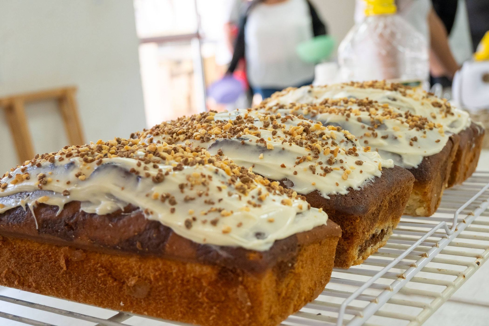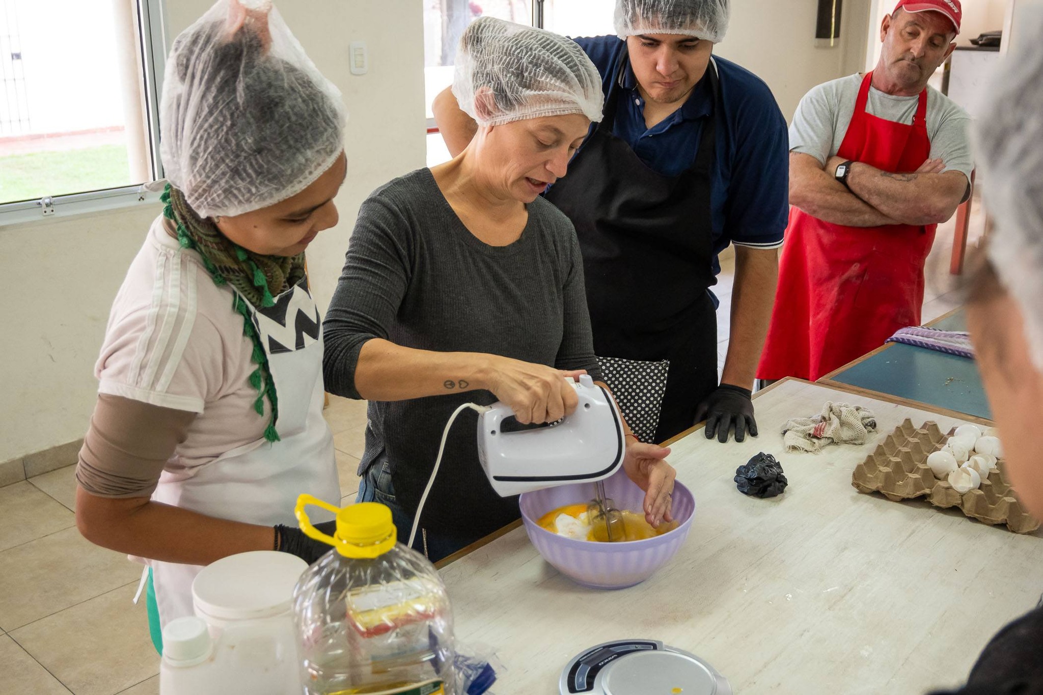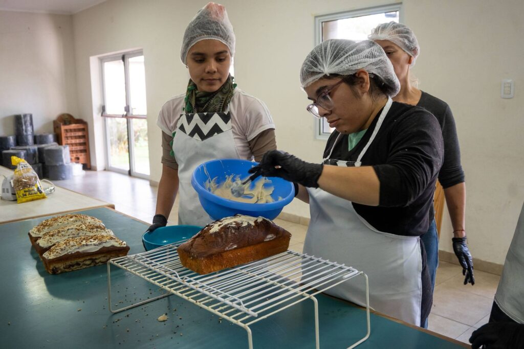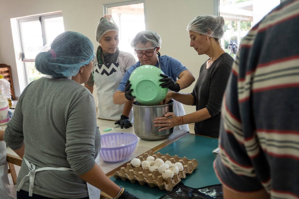 De la mano de la chef Pini Bustamante, se lleva adelante un espacio de cocina donde los participantes elaboran diferentes productos para el consumo diario del taller: