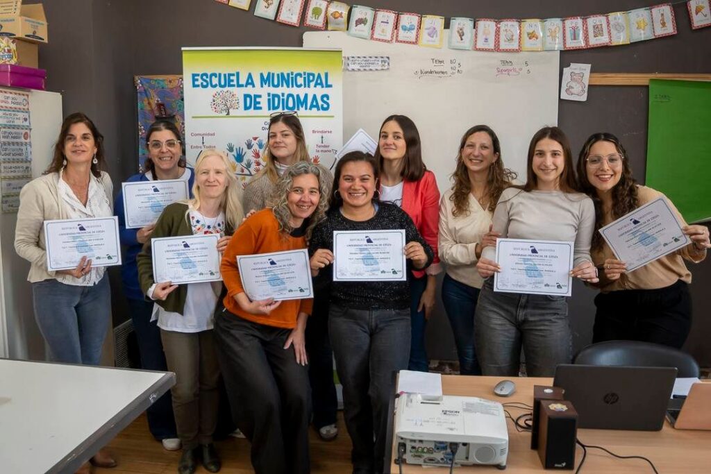 La directora de Educación, Mercedes García Duperou, junto a la coordinadora de la Escuela Municipal de Idiomas, Rocío Hernández y la profesora de la formación, entregaron los certificados correspondientes al segundo módulo a las profesoras que participaron de la capacitación.